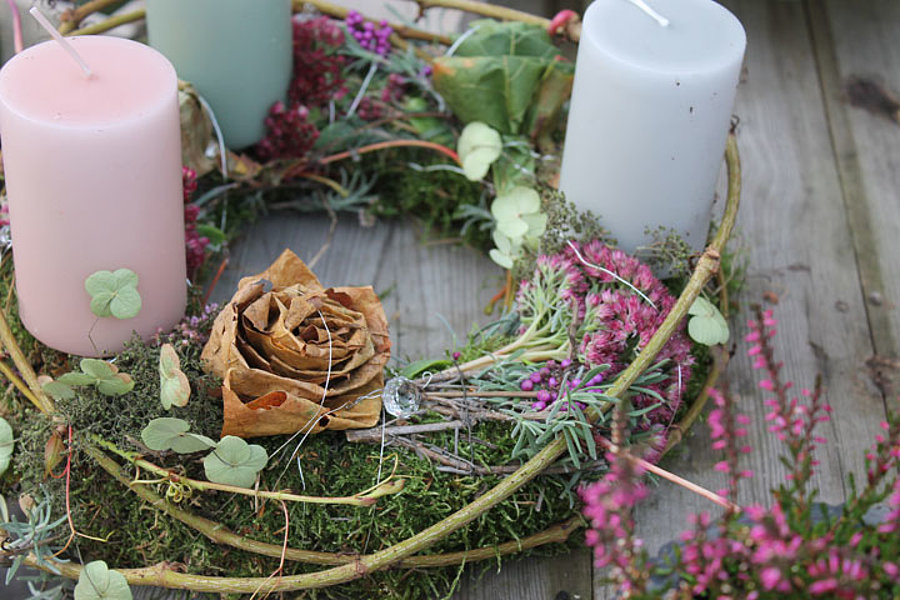 Bei uns gibt es eine vielfältige Auswahl an handgearbeiteten Kränzen, Gestecken und Dekorationen aus Naturmaterial für Anlässe wie Hochzeiten und Geburtstage oder einfach für die Haustüre.